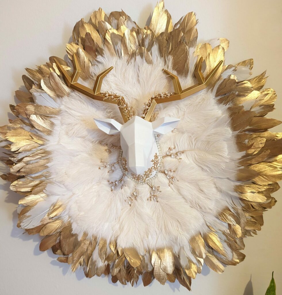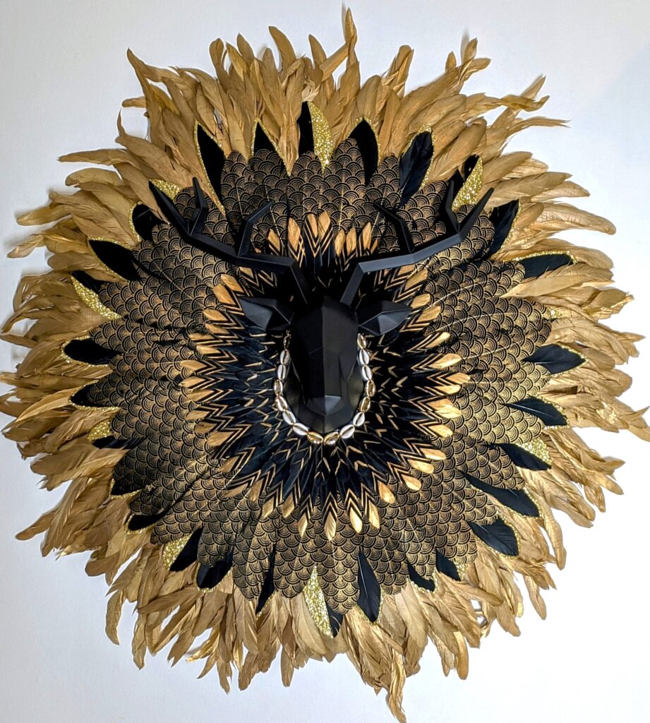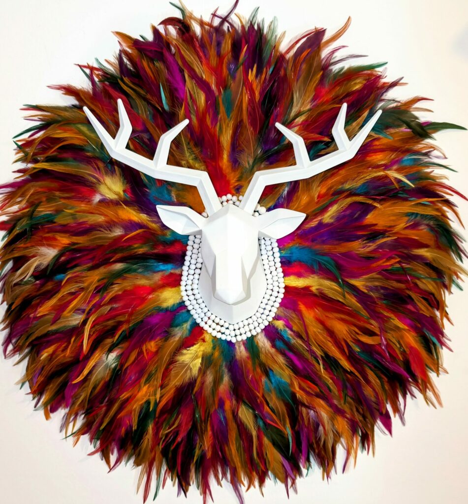 Décoration murale ornée de plumes, à l’inspiration ethnique que l’on retrouve dans la tendance déco contemporaine.